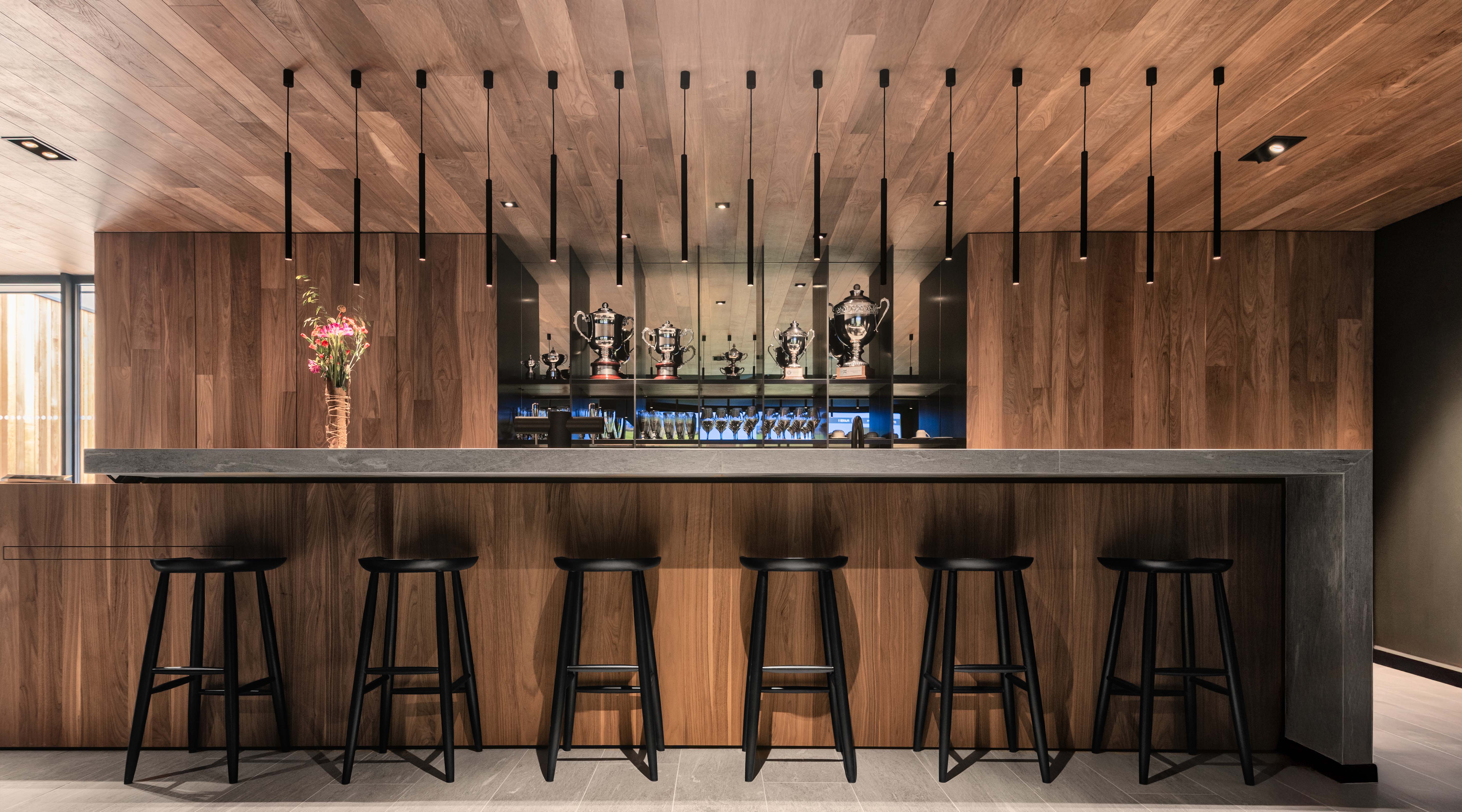 À l’intérieur, les quatre simulateurs prennent place dans un univers où la matière compose l’espace : pierre de Vals pour le sol, frêne thermochauffé en plafond, lumière contrôlée. Un environnement immersif, pensé pour l’entraînement comme pour une pratique plus ludique.